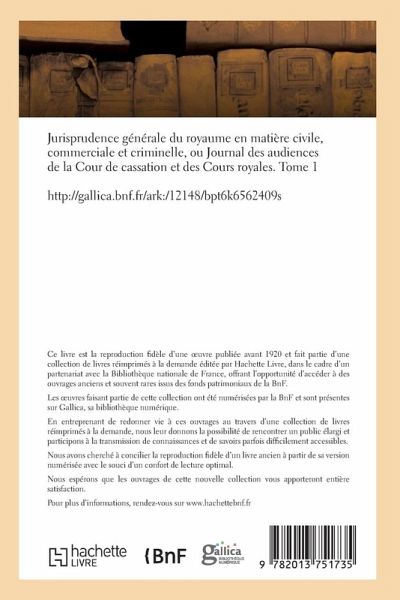 Jurisprudence générale du royaume en matière civile, commerciale et criminelle, ou Journal des audiences de la Cour de cassation et des Cours royales. Tome 1 Date de l'édition originale: 1824-1830 Le présent ouvrage s'inscrit dans une politique de conservation patrimoniale des ouvrages de la littérature Française mise en place avec la BNF. HACHETTE LIVRE et la BNF proposent ainsi un catalogue de titres indisponibles, la BNF ayant numérisé ces oeuvres et HACHETTE LIVRE les imprimant à la demande. Certains de ces ouvrages reflètent des courants de pensée caractéristiques de leur époque, mais qui seraient aujourd'hui jugés condamnables. Ils n'en appartiennent pas moins à l'histoire des idées en France et sont susceptibles de présenter un intérêt scientifique ou historique. Le sens de notre démarche éditoriale consiste ainsi à permettre l'accès à ces oeuvres sans pour autant que nous en cautionnions en aucune façon le contenu. Pour plus d'informations, rendez-vous sur www.hachettebnf.fr