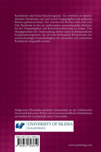 Rechtstexte sind keine Einzelereignisse. Sie entstehen in standardisierten Situationen und sind durch Vorgeprägtheit auf mehreren Ebenen gekennzeichnet. Die Autorin des Buches setzt sich zum Ziel, Rechtexte in den sie insbesondere auszeichnenden Merkmalen der Vorgeprägtheit und Konventionalisierung zu zeigen. Den Hauptgenstand der Untersuchung stellen dabei rechtssprachliche Fachphraseologismen, die als eine bedeutende Komponente der ausdrucksseitigen Formelhaftigkeit der deutschen und polnischen Rechtstexte dargestellt werden.