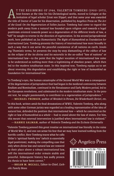 At the beginning of 1944, Valentin Tomberg (1900-1973), best-known at the time for his Christological works, moved to Cologne at the invitation of legal scholar Ernst von Hippel, and that same year was awarded the title of Doctor of Law for his dissertation, published by Angelico Press as The Art of the Good: On the Regeneration of Fallen Justice. Tomberg had come to regard the modern path away from a natural law founded upon religion and towards a legal positivism oriented towards power as a degeneration of the different levels of law, a "fall" he sought to reverse in the direction of regeneration. In his second jurisprudential work, here published as Jus Humanitatis: The Right of Humankind as Foundation for International Law, Tomberg presents the history of international law more broadly in such a way that it can serve the peaceful coexistence of all nations on earth. Invoking Thomistic terms, he presents the step-by-step dismantling of the edifice of law as the eclipse of the lex divina and lex naturalis in the so-called "law of nations" or international law-to the point that the higher vocation of international law came to be understood as nothing more than a legitimizing of absolute power, which then led to the modern totalitarian state. In this inspired text, Tomberg equips us to set about reversing this degradation and establishing the right or law of humankind as foundation for international law. "In Tomberg's eyes, the human catastrophe of the Second World War was a consequence of the degeneration of jurisprudence that had begun in the medieval controversy between Realism and Nominalism, continued in the Renaissance and Early Modern period, led to the European revolutions, and culminated in the modern totalitarian state. In the present text, he sought passionately to contribute to a regeneration of jurisprudence."-Michael Frensch, author of Weisheit in Person, Die Wiederkunft Christi, etc. "In this book, written amid the final devastations of WWII, Valentin Tomberg, who along with some other German jurists was regarded as a leading representative of the idea of natural law, defended the position that international law-which he conceived as the right or law of humankind as a whole-had to stand above the law of states. For him, this meant that external intervention is justified when international law is violated." -Harrie Salman, author of Valentin Tomberg and the Ecclesia Universalis "Valentin Tomberg penned this great treatise on international law literally in the ruins of World War II, and one can sense his fear that we may have learned nothing from the horrific conflict. Here Tomberg traces what he calls Hitler's 'spiritual family tree' (which is essentially legal positivism), making the compelling case that only when divine law and natural law are restored to their place above a robust international law, will the international order remain stable and peaceful. Subsequent history has sadly proven his thesis to have been correct."-Brian M. McCall, Editor-in-Chief, Catholic Family News