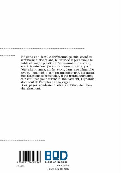 Né dans une famille chrétienne, je suis entré au séminaire à douze ans, la fleur de la jeunesse à la noble et fragile plasticité. Seize années plus tard, avant trente ans, j¿étais ordonné « prêtre pour l'éternité », mais, après avoir, dans une démarche loyale, demandé et obtenu une dispense, j¿ai quitté mes fonctions sacerdotales, il y a trente-deux ans ; ce n¿était pas pour suivre le mouvement, j¿ignorais alors tout de l'ampleur de la vague. Ces pages voudraient être un bilan de mon cheminement.
