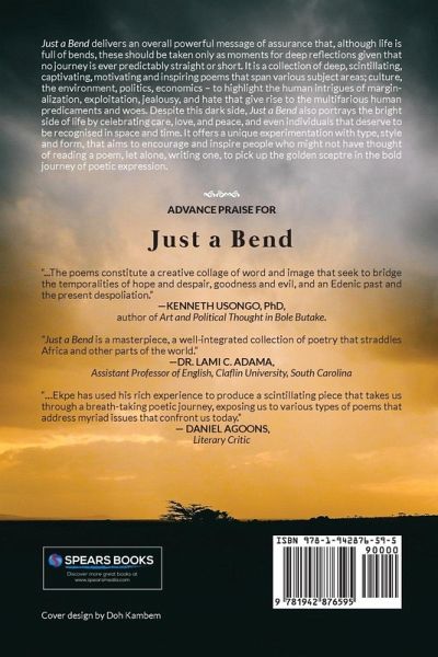Just A Bend delivers an overall powerful message of assurance that, although life is full of bends, these should be taken only as moments for deep reflections given that no journey is ever predictably straight or short. It is a collection of deep, scintillating, captivating, motivating and inspiring poems that span various subject areas; culture, the environment, politics, economics - to highlight the human intrigues of marginalization, exploitation, jealousy, and hate that give rise to the multifarious human predicaments and woes. Despite this dark side, Just A Bend also portrays the bright side of life by celebrating care, love, and peace, and even individuals that deserve to be recognised in space and time. It offers a unique experimentation with type, style and form, that aims to encourage and inspire people who might not have thought of reading a poem, let alone, writing one, to pick up the golden sceptre in the bold journey of poetic expression.
