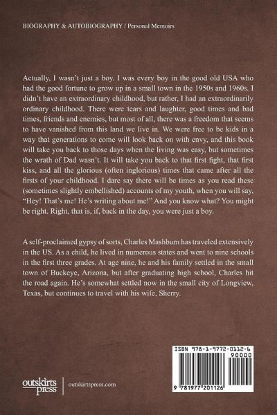 Charles Mashburn's coming-of-age novel, Just a Boy, tells the story of a boy growing up in mid-twentieth-century Buckeye, Arizona, a time and a place that allowed children to roam without care. At the same time, many children's homes, where they should have felt the safest, could be the most frightening places in the world. In spite of, maybe even because of all they encountered, they survived, and in the end, even thrived. By focusing on the good stuff and letting the bad stuff slide away, Just a Boy is not about forgetting the bad, but about looking back on it as a lesson that helped to shape a generation of boys into who they are.