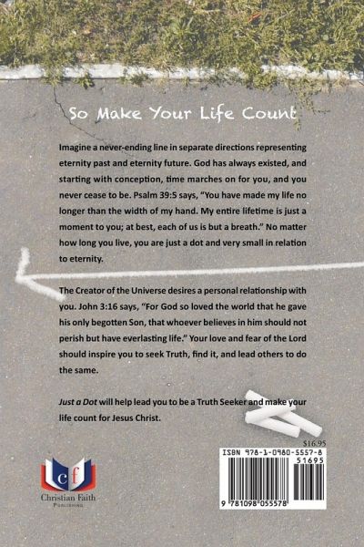 So Make Your Life Count Imagine a never-ending line in separate directions representing eternity past and eternity future. God has always existed, and starting with conception, time marches on for you, and you never cease to be. Psalm 39:5 says, "You have made my life no longer than the width of my hand. My entire lifetime is just a moment to you; at best, each of us is but a breath." No matter how long you live, you are just a dot and very small in relation to eternity. The Creator of the Universe desires a personal relationship with you. John 3:16 says, "For God so loved the world that he gave his only begotten Son, that whoever believes in him should not perish but have everlasting life." Your love and fear of the Lord should inspire you to seek Truth, find it, and lead others to do the same. Just a Dot will help lead you to be a Truth Seeker and make your life count for Jesus Christ.