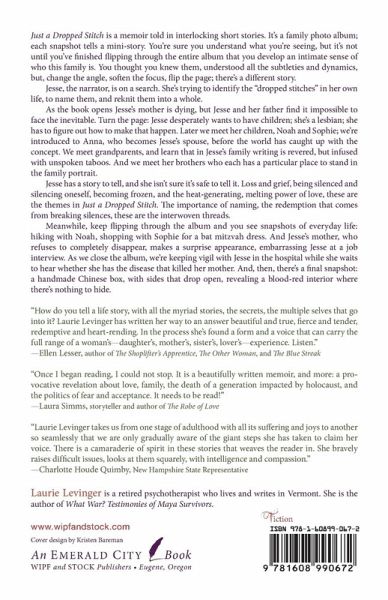 Just a Dropped Stitch is a memoir told in interlocking short stories. It's a family photo album; each snapshot tells a mini-story. You're sure you understand what you're seeing, but it's not until you've finished ¿ipping through the entire album that you develop an intimate sense of who this family is. You thought you knew them, understood all the subtleties and dynamics, but, change the angle, soften the focus, ¿ip the page; there's a different story. Jesse, the narrator, is on a search. She's trying to identify the ""dropped stitches"" in her own life, to name them, and reknit them into a whole. As the book opens Jesse's mother is dying, but Jesse and her father find it impossible to face the inevitable. Turn the page: Jesse desperately wants to have children; she's a lesbian; she has to figure out how to make that happen. Later we meet her children, Noah and Sophie; we're introduced to Anna, who becomes Jesse's spouse, before the world has caught up with the concept. We meet grandparents, and learn that in Jesse's family writing is revered, but infused with unspoken taboos. And we meet her brothers who each has a particular place to stand in the family portrait. Jesse has a story to tell, and she isn't sure it's safe to tell it. Loss and grief, being silenced and silencing oneself, becoming frozen, and the heat-generating, melting power of love, these are the themes in Just a Dropped Stitch. The importance of naming, the redemption that comes from breaking silences, these are the interwoven threads. Meanwhile, keep ¿ipping through the album and you see snapshots of everyday life: hiking with Noah, shopping with Sophie for a bat mitzvah dress. And Jesse's mother, who refuses to completely disappear, makes a surprise appearance, embarrassing Jesse at a job interview. As we close the album, we're keeping vigil with Jesse in the hospital while she waits to hear whether she has the disease that killed her mother. And, then, there's a final snapshot: a handmade Chinese box, with sides that drop open, revealing a blood-red interior where there's nothing to hide. ""How do you tell a life story, with all the myriad stories, the secrets, the multiple selves that go into it? Laurie Levinger has written her way to an answer beautiful and true, fierce and tender, redemptive and heart-rending. In the process she's found a form and a voice that can carry the full range of a woman's--daughter's, mother's, sister's, lover's--experience. Listen."" --Ellen Lesser author of The Shoplifter's Apprentice, The Other Woman, and The Blue Streak ""Once I began reading, I could not stop. It is a beautifully written memoir, and more: a provocative revelation about love, family, the death of a generation impacted by holocaust, and the politics of fear and acceptance. It needs to be read!"" --Laura Simms storyteller and author of The Robe of Love ""Laurie Levinger takes us from one stage of adulthood with all it's suffering and joys to another so seamlessly that we are only gradually aware of the giant steps she has taken to claim her voice. There is a camaraderie of spirit in these stories that weaves the reader in. She bravely raises difficult issues, looks at them squarely, with intelligence and compassion."" --Charlotte Houde Quimby New Hampshire State Representative Laurie Levinger is a retired psychotherapist who lives and writes in Vermont. She is the author of What War? Testimonies of Maya Survivors.