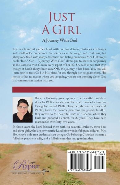 Author Bonetta Hollaway's book, "Just A Girl...A Journey With God," reflects her life, from childhood to adulthood. It allows you to go on her journey as she learns to trust and follow God. Through the many trials of getting married at fifteen and being a pastor's wife while raising six children, she utilizes her faith to overcome everyday life's many obstacles and hurdles. On her journey, she discovers how God orchestrated everything, even the bumps, and hurdles, to get her to see He is always with her. And as a result of her unwavering faith and commitment to God and her family, she becomes the woman she is today. Just A Girl...A Journey With God will make you laugh and cry; it will inspire and motivate you, but more significantly, it will allow you to see yourself as you partake on a journey with God. Realizing as she did, God is always there no matter what or where you are in life.