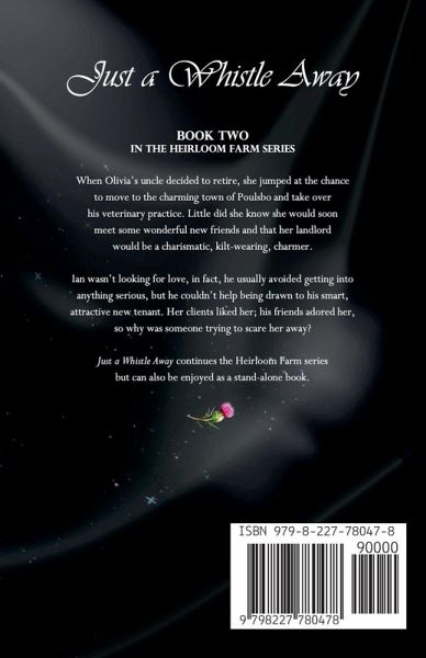 When Olivia's uncle decided to retire, she jumped at the chance to move to the charming town of Poulsbo and take over his veterinary practice. Little did she know she would soon meet some wonderful new friends and that her landlord would be a charismatic, kilt-wearing, charmer. Ian wasn't looking for love, in fact, he usually avoided getting into anything serious, but he couldn't help being drawn to his smart, attractive new tenant. Her clients liked her; his friends adored her, so why was someone trying to scare her away? Just a Whistle Away continues the Heirloom Farm series but can also be enjoyed as a stand-alone book.