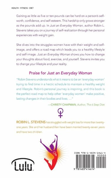 Gaining as little as five or ten pounds can be hard on a person's self-worth, confidence, and self-esteem. This hardship only grows stronger as the pounds add up. In Just an Everyday Woman, author Robin L. Stevens takes you on a journey of self-realization through her personal experiences with weight gain. She dives into the struggles women have with their weight and self-image, and offers a road map which leads you to a healthy lifestyle and self-image. Just an Everyday Woman shows you how to change your thoughts about food, exercise, and yourself. Stevens invites you to change your lifestyle and your reality. Praise for Just an Everyday Woman "Robin Stevens understands what it means to be an 'everyday woman' trying to find time in a hectic schedule to maintain a healthy weight and lifestyle. Robin's personal journey is inspiring, and this book is the perfect road map to help other 'everyday women' make positive, lasting changes in their bodies and lives. ..." -Christy Chapman, Author, The 6 Step Diet