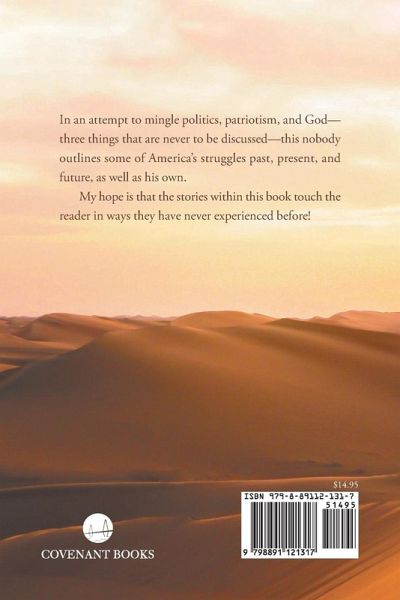 In an attempt to mingle politics, patriotism, and God--three things that are never to be discussed--this nobody outlines some of America's struggles past, present, and future, as well as his own. My hope is that the stories within this book touch the reader in ways they have never experienced before!