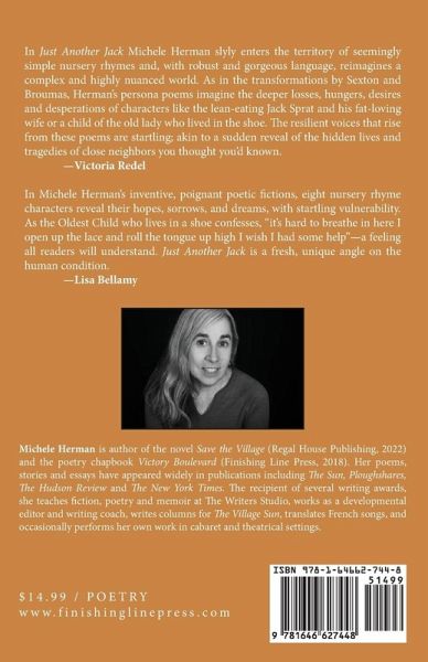 In Just Another Jack: The Private Lives of Nursery Rhymes, poet and novelist Michele Herman explores a variety of timeless human predicaments - adolescent lust, overprotective parents, dementia, gender confusion and more - by imagining her way into the actual lives of eight familiar nursery-rhyme characters. Many authors have taken fictional or mythological characters and brought them into our contemporary world, but these eight story-poems accomplish something more unusual by roaming around in Mr. and Mrs. Sprat's house to find out what ails them, following little Bo Beep out to the Welsh pasture to learn how she lost track of her sheep, conjuring up a twin brother for Little Miss Muffet, and much more.