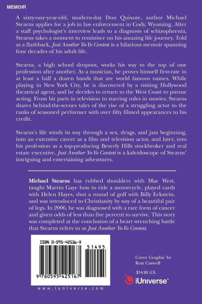 A sixty-one-year-old, modern-day Don Quixote, author Michael Stearns applies for a job in law enforcement in Cody, Wyoming. After a staff psychologist's interview leads to a diagnosis of schizophrenia, Stearns takes a moment to reminisce on his amazing life journey. Told as a flashback, Just Another Yo-Yo Contest is a hilarious memoir spanning four decades of his adult life. Stearns, a high school dropout, works his way to the top of one profession after another. As a musician, he proves himself first-rate in at least a half a dozen bands that are world famous names. While playing in New York City, he is discovered by a visiting Hollywood theatrical agent, and he decides to return to the West Coast to pursue acting. From bit parts in television to starring roles in movies, Stearns shares behind-the-scenes tales of the rise of a struggling actor to the ranks of seasoned performer with over fifty filmed appearances to his credit. Stearns's life winds its way through a sex, drugs, and jazz beginning, into an extensive career as a film and television actor, and later, into his profession as a top-producing Beverly Hills stockbroker and real estate executive. Just Another Yo-Yo Contest is a kaleidoscope of Stearns' intriguing and entertaining adventures.