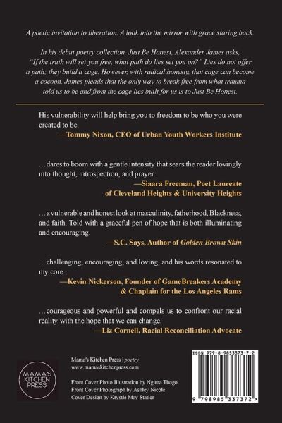 A poetic invitation to liberation. A look into the mirror with grace staring back. In his debut poetry collection, Just Be Honest, Alexander James asks, "If the truth will set you free, what path do lies set you on?" Lies do not offer a path; they build a cage. However, with radical honesty, that cage can become a cocoon. James pleads that the only way to break free from what trauma told us to be and from the cage lies built for us is to Just Be Honest.