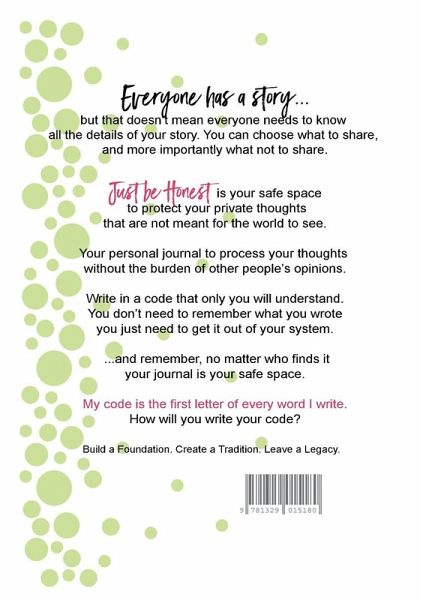 Everyone has a story, but that doesn't mean everyone needs to know the details of your story! Just be Honest is your personal space where every entry can be written in your own secret code. A private space to express what makes you happy, sad or down-right mad! A space to journal from your heart and rejuvenate your spirit. When you need a moment of peace and quiet, grab a pen and your journal and Just be Honest. You will be amazed at how writing it out can be the beginning of self-awareness, quiet confidence, and developing an understanding of who you really are.