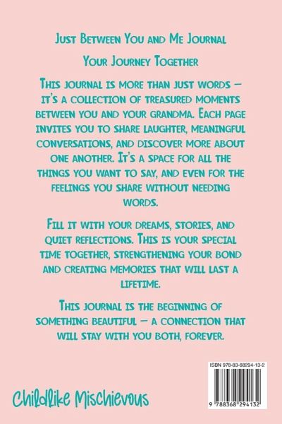 Grandma, you know, sometimes it's hard for us to really talk about the important things, even though we spend time together. The days go by so fast, and sometimes the things I want to ask or share slip away before I even get the chance. But I truly want to talk to you about what makes me happy, what worries me, and even my dreams - the ones I haven't shared yet. I found something that could help us make these conversations even more meaningful - a special journal just for us. It's called the Just Between You and Me Journal, made for grandmas and grandkids, especially for kids like me, ages 6 to 12, to explore the deeper parts of our relationship. It gives us a chance to slow down and connect, to ask questions and share answers that we might not think of in our day-to-day lives. This journal isn't just any notebook - each page is filled with thoughtful prompts and questions that help us talk about the things that truly matter. We can reflect on your memories, talk about my dreams, and share our thoughts about life, school, family, and everything in between. We can celebrate the little things, and when something hard comes along, this journal can help us get through it together. Grandma, this journal is for us. It's a space for love, laughter, reflection, and creating memories that we'll cherish forever. Will you fill it out with me?