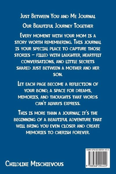 Just Between You and Me - A Guided Journal for Mother and Son is a meaningful journal designed for mothers and sons aged 8 and up. This interactive, pass-back-and-forth diary is filled with thoughtful prompts and creative activities that help build a stronger, more understanding bond. Why This Journal Is EssentialStrengthens Emotional Connection - Thoughtful prompts encourage open conversations, bringing mothers and sons closer together. Fosters Openness and Empathy - Encourages sharing feelings and thoughts, helping both to understand each other's perspectives. Supports Emotional Growth - Guides children in recognizing and managing emotions, building self-awareness and self-esteem. Improves Communication Skills - Helps develop active listening and healthy expression of thoughts and emotions. Creates Lasting Memories - The shared stories and reflections become treasured keepsakes for years to come. Sparks Creativity - Fun and engaging prompts inspire imaginative thinking and self-expression. Builds Trust and Understanding - The pass-back format offers a safe space for honest and heartfelt conversations. This journal is the perfect tool for any mother and son looking to deepen their relationship, improve communication, and create meaningful memories together. It also makes a thoughtful gift that fosters love, trust, and connection.