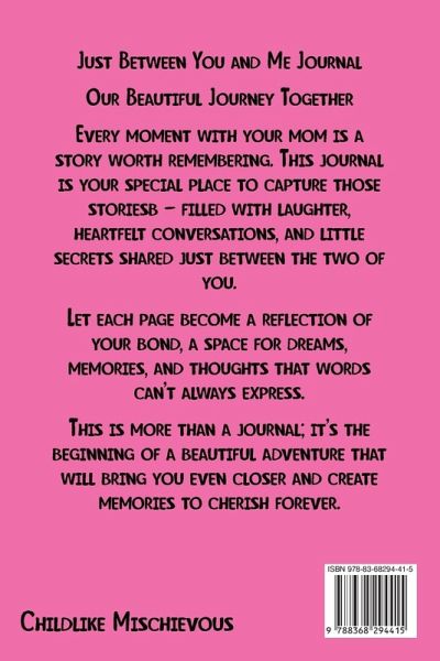 Just Between You and Me - A Guided Journal for Mother and Daughter is a meaningful journal designed for mothers and daughters aged 8 and up. This interactive, pass-back-and-forth diary is filled with thoughtful prompts and creative activities that help build a stronger, more understanding bond. Why This Journal Is EssentialStrengthens Emotional Connection - Thoughtful prompts encourage open conversations, bringing mothers and daughters closer together. Fosters Openness and Empathy - Encourages sharing feelings and thoughts, helping both to understand each other's perspectives. Supports Emotional Growth - Guides children in recognizing and managing emotions, building self-awareness and self-esteem. Improves Communication Skills - Helps develop active listening and healthy expression of thoughts and emotions. Creates Lasting Memories - The shared stories and reflections become treasured keepsakes for years to come. Sparks Creativity - Fun and engaging prompts inspire imaginative thinking and self-expression. Builds Trust and Understanding - The pass-back format offers a safe space for honest and heartfelt conversations. This journal is the perfect tool for any mother and daughter looking to deepen their relationship, improve communication, and create meaningful memories together. It also makes a thoughtful gift that fosters love, trust, and connection.