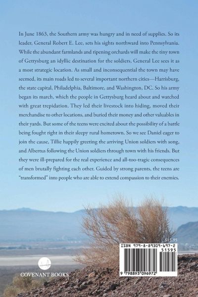 In June 1863, the Southern army was hungry and in need of supplies. So its leader, General Robert E. Lee, sets his sights northward into Pennsylvania. While the abundant farmlands and ripening orchards will make the tiny town of Gettysburg an idyllic destination for the soldiers, General Lee sees it as a most strategic location. As small and inconsequential the town may have seemed, its main roads led to several important northern cities--Harrisburg, the state capital, Philadelphia, Baltimore, and Washington, DC. So his army began its march, which the people in Gettysburg heard about and watched with great trepidation. They led their livestock into hiding, moved their merchandise to other locations, and buried their money and other valuables in their yards. But some of the teens were excited about the possibility of a battle being fought right in their sleepy rural hometown. So we see Daniel eager to join the cause, Tillie happily greeting the arriving Union soldiers with song, and Albertus following the Union soldiers through town with his friends. But they were ill-prepared for the real experience and all-too-tragic consequences of men brutally fighting each other. Guided by strong parents, the teens are "transformed" into people who are able to extend compassion to their enemies.