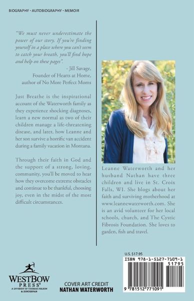 "We must never underestimate the power of our story. If you’re finding yourself in a place where you can’t seem to catch your breath, you’ll find hope and help on these pages". - Jill Savage, Founder of Hearts at Home, author of No More Perfect Moms Just Breathe is the inspirational account of the Waterworth family as they experience shocking diagnoses, learn a new normal as two of their children manage a life-threatening disease, and later, how Leanne and her son survive a horrific van accident during a family vacation in Montana. Through their faith in God and the support of a strong, loving, community, you’ll be moved to hear how they overcome extreme obstacles and continue to be thankful, choosing joy, even in the midst of the most difficult circumstances.