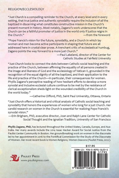 Just Church engages the reader in the synodal pathway to a "Just Church" that can and should reflect its social teaching. An important measure of justice is an ecclesiology open to participation by others beyond celibate clerics, especially in consideration of competing Catholic ecclesial bodies and methods of membership. Endorsements "Just Church is a compelling reminder to the Church, at every level and in every setting, that true justice and authentic synodality require the inclusion of all the baptized in discerning what constitutes constructive mission in the Church's present moment in history. Most notably, Zagano's work underscores that the Church can be a faithful promoter of justice in the world only if justice reigns in the Church." --from the foreword "Pope Francis's vision for the future, synodality, and a Church in which lay women and men become active participants in shaping that future are all addressed here in crystal-clear prose. A trenchant critic of ecclesiastical humbug, Zagano points the way forward to a more just Church." --Paul Lakeland, director of the Center for Catholic Studies at Fairfield University "Just Church looks to connect the dots between Catholic social teaching and the practice of the Church, between affirming the equality of all persons created in the image and likeness of God and the ecclesiology of Vatican II, grounded in the recognition of the equal dignity of all the baptized, and their application to the life and practice of the Church--in particular, their consequences for women. Phyllis Zagano's perceptive reading of how hesitant efforts to develop a more synodal and inclusive ecclesial culture continue to be met by the resistance of clerical exceptionalism sheds light on the wounded credibility of the Church in the world today." --Catherine Clifford, PhD, Saint Paul University, Ottawa, Ontario "Just Church offers a historical and critical analysis of Catholic social teaching and synodality that honors the experiences of women who long for a just Church. Her candid research on women in the Church is essential for realizing Pope Francis's synodal vision." --Erin Brigham, PhD, executive director, Joan and Ralph Lane Center for Catholic Social Thought and the Ignatian Tradition, University of San Francisco Phyllis Zagano, PhD, has lectured throughout the United States, Canada, Europe, and Australia. Her many awards include the 2014 Isaac Hecker Award for Social Justice from the Paulist Center Community in Boston. Her groundbreaking work on women in the diaconate led to her appointment in 2016 to the Pontifical Commission for the Study of the Diaconate of Women. Her most recent book is Women Religions, Women Deacons (Paulist Press, 2022). +
