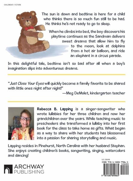 The sun is down and bedtime is here for a child who thinks there is so much fun still to be had. He thinks he's not ready to go to sleep. When he climbs into bed, the boy discovers his playtime continues as the Sandman delivers sweet dreams that allow him to fly to the moon, look at dolphins from a hot air balloon, and ride an elephant in a circus parade. In this delightful tale, bedtime isn't so bad after all when a boy's imagination slips into adventurous dreams. "Just Close Your Eyes will quickly become a family favorite to be shared with little ones night after night!" -Meg DeMolet, kindergarten teacher