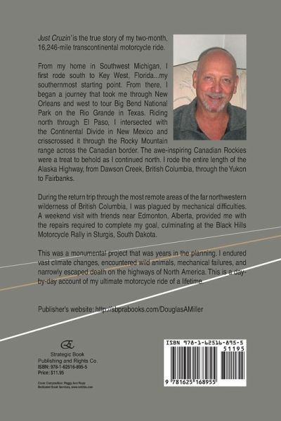 Just Cruizin' is the true story of my two-month, 16,246-mile transcontinental motorcycle ride. From my home in Southwest Michigan, I first rode south to Key West Florida... my southernmost starting point. From there, I began a journey that took me through New Orleans and west to tour Big Bend National Park on the Rio Grande in Texas. Riding north through El Paso, I intersected with the Continental Divide in New Mexico and crisscrossed it through the Rocky Mountain range across the Canadian border. The awe-inspiring Canadian Rockies were a treat to behold as I continued north. I rode the entire length of the Alaska Highway, from Dawson Creek, British Columbia, through the Yukon to Fairbanks. During the return trip through the most remote areas of the far northwestern wilderness of British Columbia, I was plagued by mechanical difficulties. A weekend visit with friends near Edmonton, Alberta, provided me with the repairs required to complete my goal, culminating at the Black Hills Motorcycle Rally in Sturgis, South Dakota. This was a monumental project that was years in the planning. I endured vast climate changes, encountered wild animals, mechanical failures, and narrowly escaped death on the highways of North America. This is a day-by-day account of my ultimate motorcycle ride of a lifetime. Publisher's website: http://sbprabooks.com/DouglasAMiller