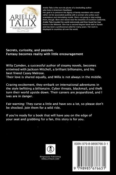 Secrets, curiosity, and passion. Fantasy becomes reality with little encouragement. Willa Camden, a successful author of steamy novels, becomes entwined with Jackson Mitchell, a brilliant billionaire, and his best friend Casey Melrose. Their love is shared equally, and Willa is not always in the middle. Craving excitement, they embark on international adventures in the style befitting a billionaire. Cyber threats, blackmail, and theft turn their world upside down. Their careers are jeopardized, and lives are in danger. Fair warning: They curse a little and have sex a lot, so please don't be shocked. Join them for a wild ride. If you're ready for a book that will have you on the edge of your seat and grabbing for a fan, this story is for you.
