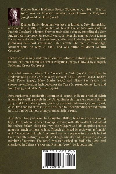 Eleanor Emily Hodgman Porter (December 19, 1868 - May 21, 1920) was an American novelist, most known for Pollyanna (1913) and Just David (1916). Eleanor Emily Hodgman was born in Littleton, New Hampshire, on December 19, 1868, the daughter of Llewella French (née Woolson) and Francis Fletcher Hodgman. She was trained as a singer, attending the New England Conservatory for several years. In 1892 she married John Lyman Porter and relocated to Massachusetts, after which she began writing and publishing her short stories and, later, novels. She died in Cambridge, Massachusetts, on May 21, 1920, and was buried at Mount Auburn Cemetery. Porter wrote mainly children's literature, adventure stories, and romance fiction. Her most famous novel is Pollyanna (1913), followed by a sequel, Pollyanna Grows Up (1915). Her adult novels include The Turn of the Tide (1908), The Road to Understanding (1917), Oh Money! Money! (1918), Dawn (1919), Keith's Dark Tower (1919), Mary Marie (1920) and Sister Sue (1921); her short-story collections include Across the Years (c. 1919), Money, Love and Kate (1923), and Little Pardner (1926). Porter achieved considerable commercial success: Pollyanna ranked eighth among best-selling novels in the United States during 1913, second during 1914, and fourth during 1915 (with 47 printings between 1915 and 1920); Just David ranked third in 1916; The Road to Understanding ranked fourth in 1917; and Oh Money! Money! ranked fifth in 1918. Just David, first published by Houghton Mifflin, tells the story of a young boy, David, who must learn to adapt to living with others after the death of his recluse father; along the way, the villagers and his adoptive parents adopt as much or more to him. Though criticized by reviewers as "mush" and "too perfectly lovely, "the novel was very popular in the early half of the twentieth century in middle and high schools, and has recently seen a number of reprints. The novel was transcribed in Braille in 1922, and translated in Chinese (1959) and Russian (2005). (wikipedia.org)