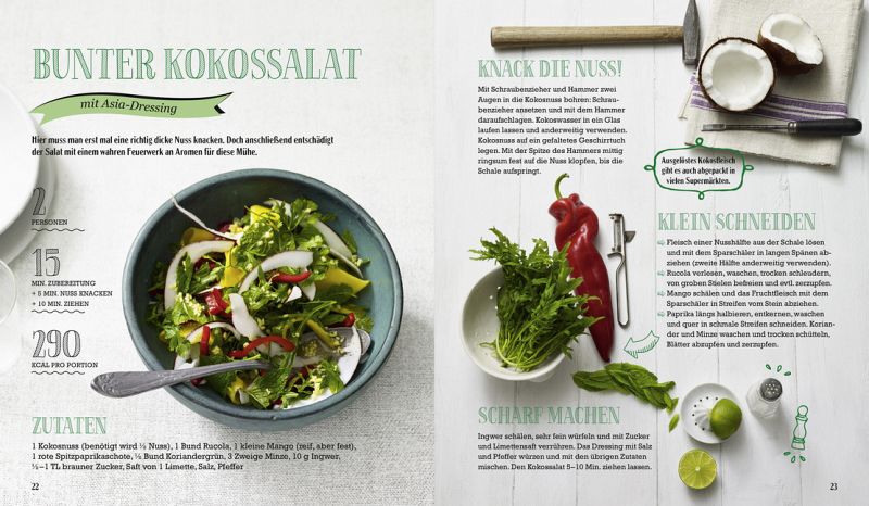 Duftet und schmeckt wie Urlaub im Paradies: Die Kokosnuss weckt Urlaubsgefühle! Egal ob Kokoswasser, Kokosöl oder Kokosblütenzucker - die Nuss ist in aller Munde. Und das aus gutem Grund: Die exotische Frucht schützt vor chronischen Erkrankungen, stärkt das Immunsystem und hilft beim Entgiften. Ein echtes Superfood also, das jedes Gericht zum Gesundheitsbooster macht. In der Coconut Kitchen sind alle Rezepte ganz einfach und übersichtlich im Bild dargestellt - so kann jeder direkt loslegen und Leckereien zaubern wie Green Coconut Curry oder Kokos-Salat, verführerische Kokos-Schoko-Pralinés oder Kokos- Chia-Puddings. Paradiesisch gesund und exotisch lecker!