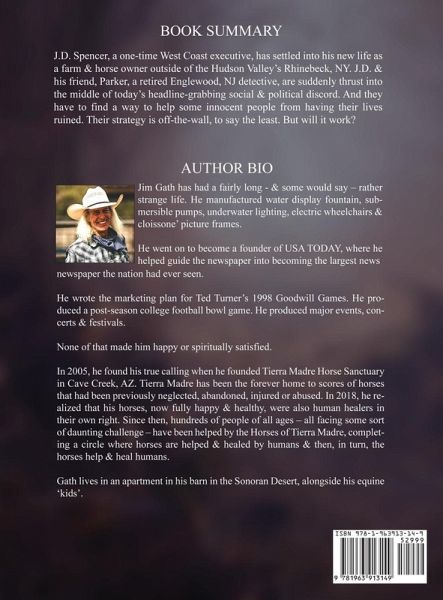 J.D. Spencer, a one-time West Coast executive, has settled into his new life as a farm & horse owner outside of the Hudson Valley's Rhinebeck, NY. J.D. & his friend, Parker, a retired Englewood, NJ detective, are suddenly thrust into the middle of today's headline-grabbing social & political discord. And they quickly have to find a way to help some innocent people from having their lives ruined. Their law-skirting strategy is off-the-wall, to say the least. But will it work? Remember, this part of the Hudson Valley was home to the Headless Horseman......