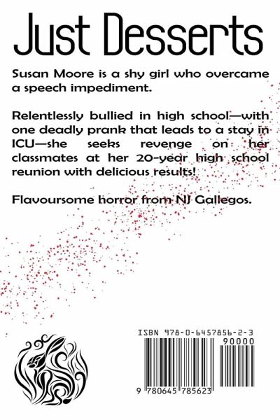 Susan Moore is a shy girl who overcame a speech impediment. Relentlessly bullied in high school-with one deadly prank that leads to a stay in ICU stay-she seeks revenge on her classmates at her 20-year high school reunion with delicious results! Flavoursome horror from NJ Gallegos.