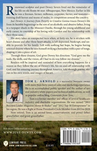 Renowned sculptor and poet Dewey Severs lived out the remainder of his life on old Route 66 near Albuquerque, New Mexico. Earlier in life he was a fireman, farmer, milkman, carpenter, farrier, and teamster-training draft horses and teams of mules, in competition around the country. Just Dewey: A Journey from Poverty to Creative Genius traces Dewey's life from its humble beginnings as the son of an alcoholic and abusive father, living in a tarpaper shack in the Missouri Ozarks, through his young adulthood and early career, to courtship of his loving wife Carolyn and his relationship with their three sons. His story takes an unexpected turn when, at forty-six, he is stricken with heart disease and after three heart attacks, is left depressed, bankrupt, and unable to provide for his family. Left with nothing but hope, he begins having unusual dreams where he sees himself striking a horseshoe with a pair of tongs, shaping it into a piece of art. Through these dreams, God gives Dewey his direction: "God gave me the tools, the skills, and the vision, all I had to do was follow my dreams." Readers will be inspired and reminded of how everything happens for a reason as they follow the arc of Dewey's life, his on-and-off relationship with God, and his amazing journey throughout America, told through poems, stories in his own words, and images of his art.
