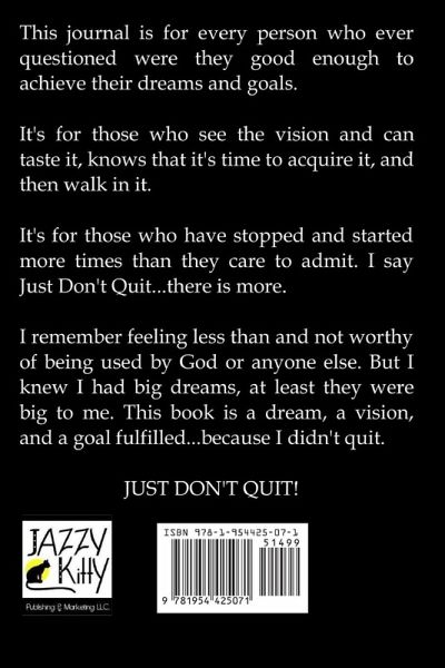 This journal is for every person who's ever questioned were they good enough to achieve their dreams and goals. It for those who see the vision and can taste, know that it's time to acquire it, and then to walk in it. It's for those who have stopped and started more times than they've cared to admit. I say Just Don't Quit...there is more. I remember feeling less than and not worthy of being used by God or anyone else. But I knew I had big dreams, at least they were big to me. This book is a dream, a vision and a goal fulfilled...because I didn't quit. Note From the Author For every tear, pain, trauma, and inward struggle thank you. You have been my greatest teacher and the gift of God has been my greatest reward. I wish I could take responsibility for the total of my life experiences, but that would create a false truth that I would never present to anyone. So, I say thank you, God, because You have been the solidarity and confidence that my life needs and requires.