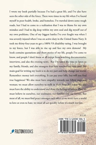 I wrote my book partially because I've had a great life, and I've also have seen the other side of the fence. There were times in the life when I've found myself in poor health, broke, and homeless. I've traveled down some rough roads, but I had to come to a realization that I was partially to blame for my own mistakes and I had to dig deep within my own soul and dig myself out of my own problems. One of my biggest battles I've ever fought was when I was severely injured when I was on active duty in the United States Navy. It took me thirty-four years to get a 100% VA disability rating. I was brought to my knees, but I was able to rise up and face my own demons! My book contains quotations and short stories of my life, people I've come to know, and people I don't know at all except from watching documentaries, interviews, and also the evening news. But I've taken the time to listen to my family, friends, and also strangers that have touched my very soul. My main goal for writing my book is to do my part and help change our world. Remember: money isn't everything. It can pay your bills, but will you find true happiness? We also must have empathy towards our fellow man and woman; we must allow ourselves to walk in their shoes for a day. We also must have the ability to understand and share the feelings of others. Plus, we must believe in love towards ourselves, our family and friends, and our soulmates. But most of all, we must find peace amongst each other or we won't have a world to love or even to hate; we must all act quickly before it's much too late!