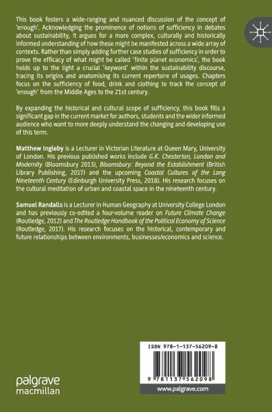 Part I.- 1.Introduction- Samuel Randalls and Matthew Ingleby.- 2. Enough: A Lexical-Semantic approach- Kathryn Allan.- Part II.- 3. Enough-ness in the later Middle Ages- Hannah Skoda.- 4.Daily Bread: Ideas of Sufficiency in Early Modern England- Ethan Shagan.- Part III.- 5. Sufficiency and Simplicity in the Life and Writings of Edward Carpenter- Wendy Parkins.- 6.'These are the cases who call themselves "moderate drinkers," because they are never seen embracing a lamp-post.' The problem of moderate drinking in nineteenth- and early twentieth-century Britain- James Kneale.- Part IV.- 7.Fashion acolytes or environmental saviours? When will young people have had 'enough'?- Rebecca Collins.- 8. What would a sufficiency economy look like?- Samuel Alexander.