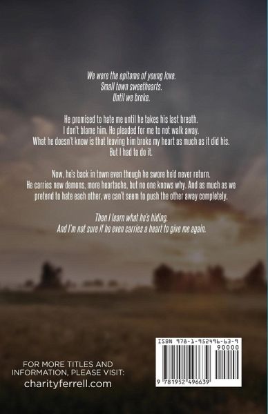We were the epitome of young love. Small town sweethearts. Until we broke. He promised to hate me until he takes his last breath. I don't blame him. He pleaded for me to not walk away. What he doesn't know is that leaving him broke my heart as much as it did his. But I had to do it. Now, he's back in town even though he swore he'd never return. He carries new demons, more heartache, but no one knows why. And as much as we pretend to hate each other, we can't seem to push the other away completely. Then I learn what he's hiding. And I'm not sure if he even carries a heart to give me again.