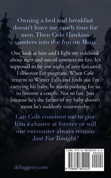 Have you heard the one about the workaholic who decides she deserves a night of fun with a sexy stranger? It's supposed to be a short story. Except one night of fun changes everything. Owning and operating a bed and breakfast doesn't leave me much time for men. Especially not men who aren't from Winter Falls. Out-of-towners can't be trusted. Trust me. I have the scars to prove it. Then Cole Hawkins saunters into the Inn on Main. One look at him and I light my rulebook about men and out-of-towners on fire before hurling it out the window. After Cole leaves town unexpectedly, I'm hell-bent on forgetting him and his adorable dimple until I discover our one night of passion has lasting consequences of the baby variety. When Cole returns to Winter Falls and discovers I'm pregnant, he starts pushing for us to become a couple. Not so fast. Just because he's the father of my baby doesn't mean he's suddenly trustworthy. Can Cole convince me to give him a chance at forever or will our encounter always remain Just For Tonight? This small town romantic comedy features a woman who defines the word stubborn, a man who's not giving up on her and their baby not matter how stubborn she is, a not planned but most welcome pregnancy, a gaggle of sisters who want to try their hands at matchmaking, and a whole town full of hippies who think being called a busybody is a compliment. Just For Forever is a standalone novel in the Winter Falls series.
