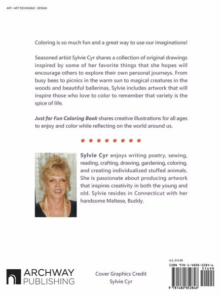 Coloring is so much fun and a great way to use our imaginations! Seasoned artist Sylvie Cyr shares a collection of original drawings inspired by some of her favorite things that she hopes will encourage others to explore their own personal journeys. From busy bees to picnics in the warm sun to magical creatures in the woods and beautiful ballerinas, Sylvie includes artwork that will inspire those who love to color to remember that variety is the spice of life. Just for Fun Coloring Book shares creative illustrations for all ages to enjoy and color while reflecting on the world around us.