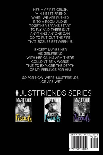 Fans of new adult authors like Abbi Glines and Jamie McGuire will love this brand new book by Marie Cole about being in love with your best friend. And how much it really sucks. He's my first crush. I'm his best friend. When we are pushed into a room alone together sparks start to fly and there isn't anything anyone can do to put out the fire that sizzles between us. Except maybe her His girlfriend. With her on his arm there couldn't be a worse time to explore the depth of my feelings for him. So for now we're #JustFriends. ...Or are we?