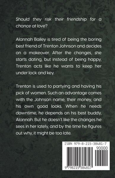 Should they risk their friendship for a chance at love? Alannah Bailey is tired of being the boring best friend of Trenton Johnson and decides on a makeover. After the changes, she starts dating, but instead of being happy, Trenton acts like he wants to keep her under lock and key. Trenton is used to partying and having his pick of women. Such an advantage comes with the Johnson name, their money, and his own good looks. When he needs downtime, he depends on his best buddy, Alannah. But he doesn't like the changes he sees in her lately, and by the time he figures out why, it might be too late.