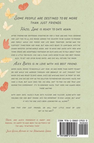 Hazel Lane is ready to date again. After finding her boyfriend cheating on her a year ago and thus severing her last ties to LA, she moved across the country to be closer to friends and family. While she pieced her life back together, dating was the furthest thing from her mind. But now she's ready to jump back into the shark-infested dating world again. And to avoid bad dates with men who think Crocs are acceptable footwear or guys who like to talk about their exes a little too much, she has a plan. She's going to ask her best friend, Alex, to set her up on blind dates, and she will return the favor. Alex Bates is in love with his best friend. When Hazel moved to Nashville last year, he was more than happy to wait on her while she worked through her breakup. He just thought that when she was ready to date again, she'd see who was right in front of her. And yes, she did see him-as the solution to finding her soulmate. Hazel may have a plan, but Alex does too. His goal isn't to find his one true love during this experiment, it's to convince Hazel that hers has always been there waiting. With each date, Hazel's plan gets fuzzier and fuzzier, along with her feelings for her best friend. He's too important to risk losing, but what if he's the one she's been looking for all along? Can they stay just friends, or will that little issue of love get in the way?