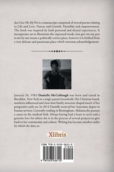 Just give me my pen is a manuscript comprised of several poems relating to Life and Love. Nature and Growth. Humility and empowerment. The book was inspired by both personal and shared experiences. It incorporates art to illuminate the expressed words. Just give me my pen is not by any means a politically correct piece, however it is birthed from a very delicate and passionate place which warrants acknowledgement.