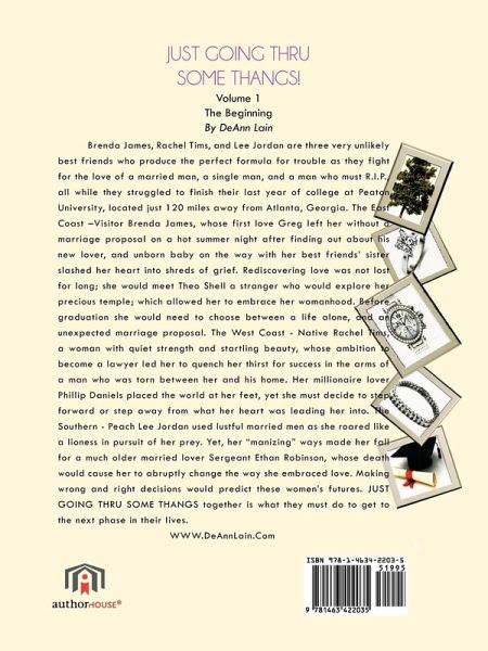 Brenda James, Rachel Tims, and Lee Jordan are three very unlikely best friends who produce the perfect formula for trouble as they fight for the love of a married man, a single man, and a man who must R.I.P., all while they struggled to finish their last year of college at Peaton University, located just 120 miles away from Atlanta, Georgia. The East Coast -Visitor Brenda James, whose first love Greg left her with a broken heart instead of a marriage proposal on a hot summer night after finding out about his new lover, and unborn baby on the way with her best friends' sister. Rediscovering love was not lost for long; she would meet Theo Shell a stranger who would explore her precious temple; which allowed her to embrace her womanhood. Before graduation she would need to choose between a life alone, and an unexpected marriage proposal. The West Coast - Native Rachel Tims, a woman with quiet strength and startling beauty, whose ambition to become a lawyer led her to quench her thirst for success in the arms of a man who was torn between her and his home. Her millionaire lover Phillip Daniels placed the world at her feet, yet she must decide to step forward or step away from what her heart was leading her into. The Southern - Peach Lee Jordan used lustful married men as she roared like a lioness in pursuit of her prey. Yet, her "manizing" ways made her fall for a much older married lover Sergeant Ethan Robinson, whose death would cause her to abruptly change the way she embraced love. Making wrong and right decisions would predict these women's futures. JUST GOING THRU SOME THANGS together is what they must do to get to the next "journey" in their lives.