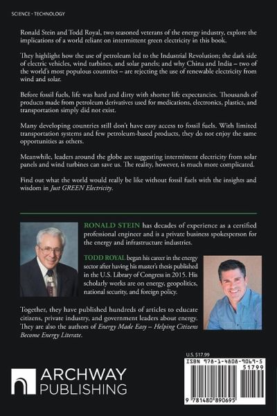 Ronald Stein and Todd Royal, two seasoned veterans of the energy industry, explore the implications of a world reliant on intermittent green electricity in this book. They highlight how the use of petroleum led to the Industrial Revolution; the dark side of electric vehicles, wind turbines, and solar panels; and why China and India - two of the world's most populous countries - are rejecting the use of renewable electricity from wind and solar. Before fossil fuels, life was hard and dirty with shorter life expectancies. Thousands of products made from petroleum derivatives used for medications, electronics, plastics, and transportation simply did not exist. Many developing countries still don't have easy access to fossil fuels. With limited transportation systems and few petroleum-based products, they do not enjoy the same opportunities as others. Meanwhile, leaders around the globe are suggesting intermittent electricity from solar panels and wind turbines can save us. The reality, however, is much more complicated. Find out what the world would really be like without fossil fuels with the insights and wisdom in Just GREEN Electricity.