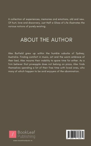 A collection of experiences, memories and emotions, old and new. Of hurt, love and discorvery, Just Half a Glass of Life illustrates the various notions of purely existing.
