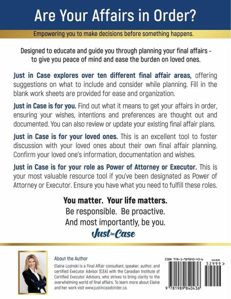 Are Your Affairs in Order? Designed to educate and guide you through planning your final affairs - to give you peace of mind and ease the burden on loved ones. Just in Case explores over ten different final affair areas, including wills, power of attorney, funeral planning and other personal information and documents that your loved ones will require for end of life, incapacity, emergency or other support needs. It offers suggestions on what to include or what to consider while planning. Detailed fill in the blank work sheets are provided for ease and organization. Just in Case is for you. Find out what it means to get your affairs in order, ensuring your wishes, intentions and preferences are thought out and documented. You can also review or update your existing plans. Just in Case is for your loved ones. This is an excellent tool to foster discussion with your loved ones about their own final affair planning confirming your loved one's information, documentation and wishes. Just in Case is for your role as Power of Attorney or Executor. This is your most valuable resource tool if you've been designated as Power of Attorney or Executor. You matter. Your life matters. Be responsible. Be proactive. And most importantly, be you. Just in Case.