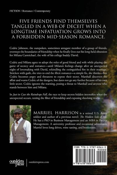 Five friends find themselves tangled in a web of deceit when a longtime infatuation grows into a forbidden mid-season romance. Cedric Johnson, the outspoken, sometimes arrogant member of a group of friends, oversteps the boundaries of friendship when he finally lives out his long-held obsession for Milana Carmichael, the wife of his college buddy David. Cedric and Milana agree to adopt the roles of good friend and wife while playing the game of secrecy and romance-until Milana's feelings change after an unexpected night of lovemaking with David, rekindling the extinguished fire in their marriage. Stricken with guilt, she tries to end the illicit romance-a simple fix, she thinks-but Cedric becomes angry and threatens to expose their secret. Marshall discovers the affair and warns Cedric of the dangers, but dares not go any further because of his own little secret. Cedric ignores the warning, posing a threat to Marshall and anyone who stands between him and Milana. In Just in Case the Raindrops Fall, the race to keep secrets hidden intensifies when the unexpected occurs, testing the fiber of friendship and exposing shocking truths...
