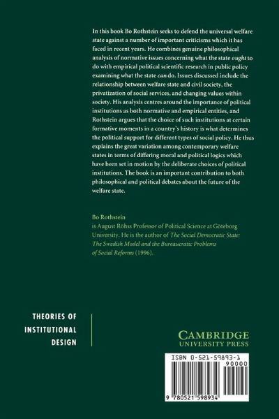 In this book Bo Rothstein seeks to defend the universal welfare state against a number of important criticisms that it has faced in recent years. Issues discussed include the relationship between welfare state and civil society, the privatization of social services, and changing values within society. He explains the great variation among contemporary welfare states in terms of differing moral and political logics that have been set in motion by the deliberate choices of political institutions. The book is an important contribution both to philosophical and political debates about the future of the welfare state.
