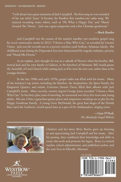 "I will always have great memories of Jack Campbell. The first song we ever recorded of his was titled 'Jesus.' It became the Rambos first number-one radio song. We enjoyed recording many others, such as 'Oh What a Happy Day' and 'March Around The Throne.' Jack was a great songwriter and a fine Christian gentleman." -Buck Rambo Jack Campbell was the creator of the nation's number one southern gospel song for seven consecutive weeks in 2012: "I Know a Man Who Can," as recorded by Greater Vision. Jack was the seventh son in a poverty-stricken rural Swifton, Arkansas, family. His childhood years during the Depression Era were characterized by tragedy, isolation, poverty, and "Hand-Me-Downs." As an orphan, Jack thought he was in a suburb of Heaven when his brother, Bill, moved Jack and his own family to Gideon, in the bootheel of Missouri. Bill would pastor the Assembly of God Church while raising Jack as if he were his own son, rather than as his younger brother. In the late 1960s and early 1970s, gospel radio was filled with his music. Many of the industry's top artists, including the Rambos, the Inspirations, the Speer Family, the Kingsmen Quartet, and soloist, Governor Jimmie Davis, filled their albums with Jack Campbell's music. More recently, country legend George Jones recorded "I Know a Man Who Can." In his forty-plus years of traveling, he mentored over forty-five teens and young adults. His son, Chris, a great bass guitar player and songwriter, would go on to play for the Happy Goodman Family. A young Gene McDonald, the great bass singer of the Florida Boys (and the Gaithers), would spend time as a part of the Ambassadors, singing tenor. -Gary O'Neal, The Absolutely Gospel Website
