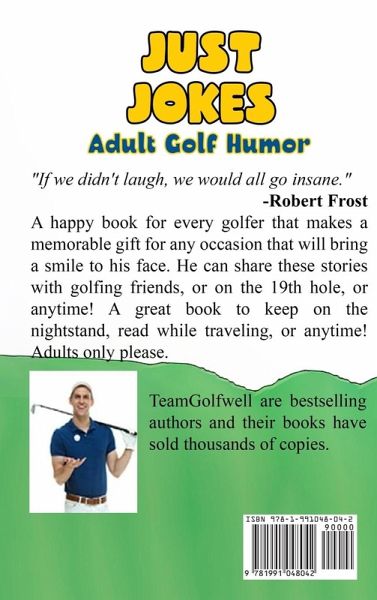 "Lots of good stories for me to take to my next golf outing! Five big stars!" - A Careful Reviewer, Verified Purchase. "Very funny with jokes I haven't heard before. Five Stars!" - Tom Drake, Verified purchase A hilarious book that makes a memorable gift for any occasion. It will bring a smile to the face of any adult golfer and he'll love you for the laughs it brings. He or she can share these stories with golfing friends, on the 19th hole, or anytime! A great book to keep on the nightstand, read while traveling, or anytime! An occasional funny joke helps brighten the mood! Laughter helps make a golfer relax and play better. ¿It's been scientifically proven that laughter causes the body to send more oxygen to the tissues. In fact, when laughter is combined with exercise even more oxygen flows throughout the body. A Loma Linda University Study proved laughter produces brain waves like being in a state of meditation and makes a golfer think more clearly and have more integrative thoughts, especially after a bad shot or that missed short putt. Laughter has also been shown to break a state of negativity and is extremely helpful in treating Post Traumatic Stress Disorder. He'll love you for the fun and enjoyment this book brings! Get it now! Happy golfing from TeamGolfwell! Adults only, please.