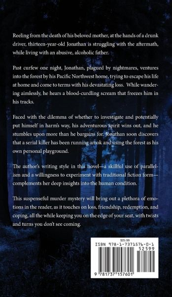 Reeling from the death of his beloved mother, at the hands of a drunk driver, thirteen-year-old Jonathan is struggling with the aftermath, while living with an abusive, alcoholic father. Past curfew one night, Jonathan, plagued by nightmares, ventures into the forest by his Pacific Northwest home, trying to escape his life at home and come to terms with his devastating loss. While wandering aimlessly, he hears a blood-curdling scream that freezes him in his tracks. Faced with the dilemma of whether to investigate and potentially put himself in harm's way, his adventurous spirit wins out, and he stumbles upon more than he bargains for. Jonathan soon discovers that a serial killer has been running amok and using the forest as his own personal playground. The author's writing style in this novel-a skillful use of parallelism and a willingness to experiment with traditional fiction form-complements her deep insights into the human condition. This suspenseful murder mystery will bring out a plethora of emotions in the reader, as it touches on loss, friendship, redemption, and coping, all the while keeping you on the edge of your seat, with twists and turns you don't see coming.