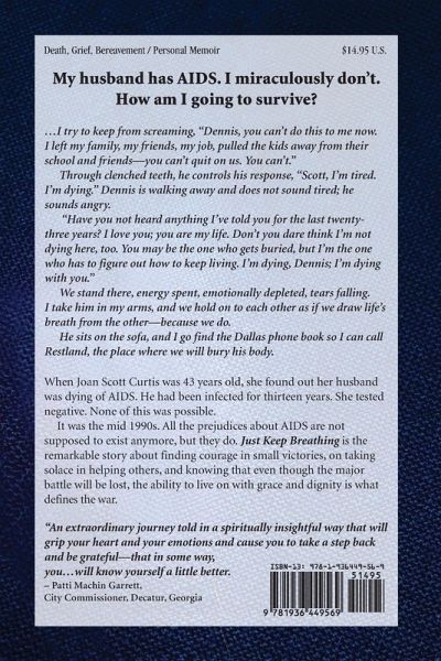 My husband has AIDS. I miraculously don't. How am I going to survive? ...I try to keep from screaming, "Dennis, you can't do this to me now. I left my family, my friends, my job, pulled the kids away from their school and friends-you can't quit on us. You can't." Through clenched teeth, he controls his response, "Scott, I'm tired. I'm dying." Dennis is walking away and does not sound tired; he sounds angry. "Have you not heard anything I've told you for the last twenty-three years? I love you; you are my life. Don't you dare think I'm not dying here, too. You may be the one who gets buried, but I'm the one who has to figure out how to keep living. I'm dying, Dennis; I'm dying with you." We stand there, energy spent, emotionally depleted, tears falling. I take him in my arms, and we hold on to each other as if we draw life's breath from the other-because we do. He sits on the sofa, and I go find the Dallas phone book so I can call Restland, the place where we will bury his body. When Joan Scott Curtis was 43 years old, she found out her husband was dying of AIDS. He had been infected for thirteen years. She tested negative. None of this was possible. It was the mid 1990s. All the prejudices about AIDS are not supposed to exist anymore, but they do. Just Keep Breathing is the remarkable story about finding courage in small victories, on taking solace in helping others, and knowing that even though the major battle will be lost, the ability to live on with grace and dignity is what defines the war. "An extraordinary journey told in a spiritually insightful way that will grip your heart and your emotions and cause you to take a step back and be grateful-that in some way, you...will know yourself a little better. Patti Machin Garrett, City Commissioner, Decatur, Georgia